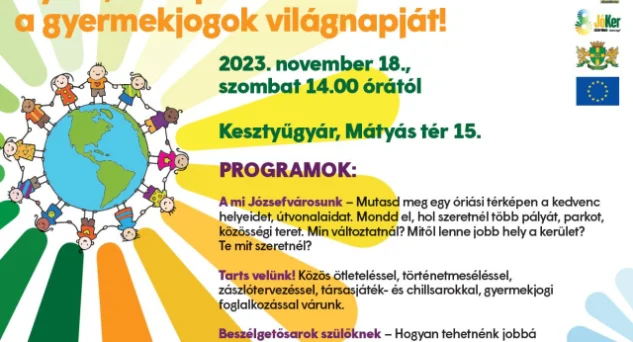 November 18-án, szombaton délután 2 órától a Kesztyűgyár Közösségi Házban (Mátyás tér 15.) kerül sor a gyermekjogok világnapjának megünneplésére, amelynek során számos program várja a gyerekeket, fiatalokat és a szülőket is. A világ országait tömörítő ENSZ közgyűlése – mintegy tíz év előkészítő munka után – 1989. november 20-án fogadta el a Gyermekjogi Egyezményt. Ez írja … Bővebben: Gyermekjogok világnapja